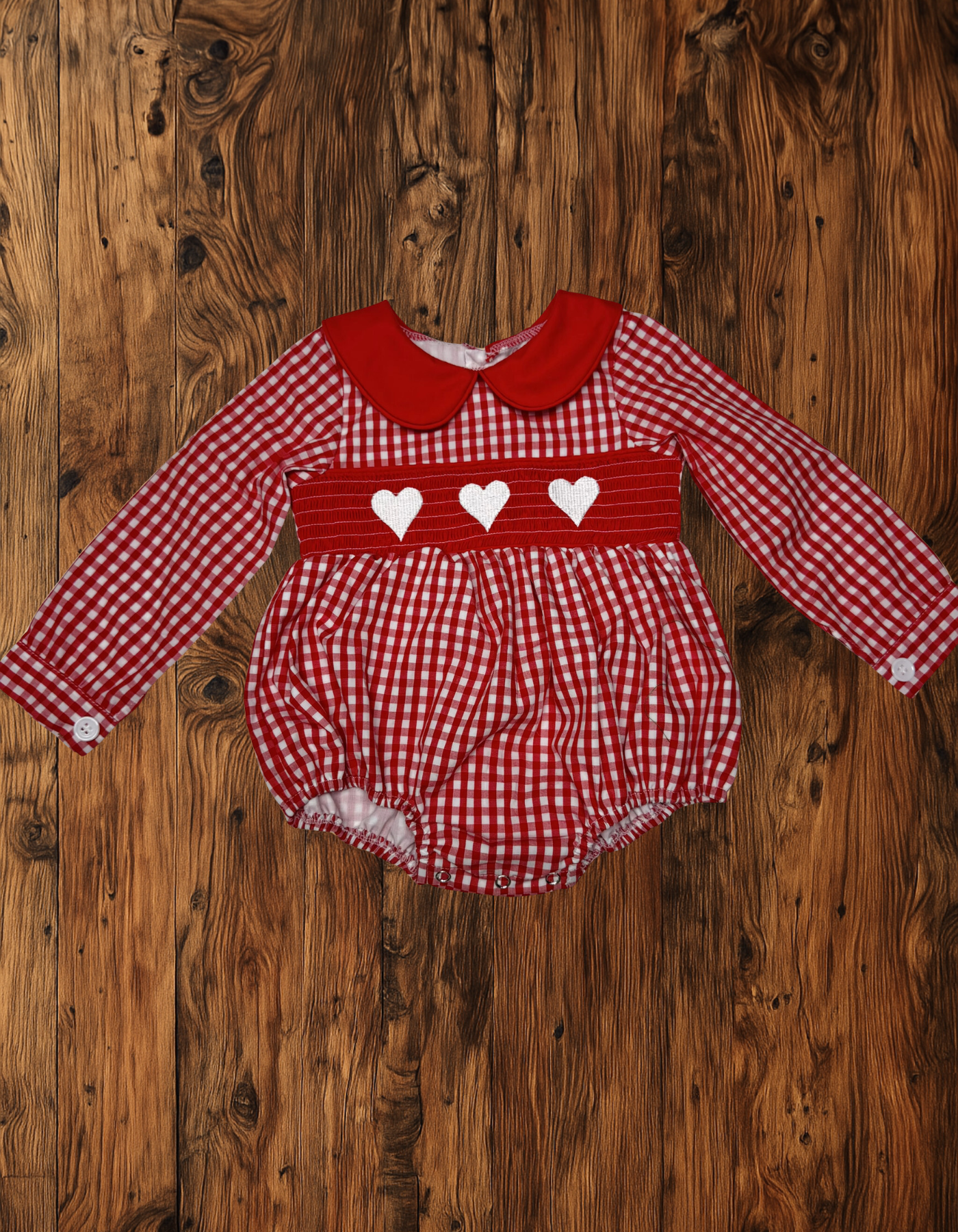 Cupid's got nothing on this adorable bubble! Featuring a charming red gingham plaid pattern with sweet heart details, this classic piece is as cute as it gets. The smocked detailing adds texture and visual interest, while the crisp collar keeps things polished. Button sleeves offer adjustable comfort, and easy-access snaps make diaper changes a breeze. Perfect for little ones who love looking picture-perfect.