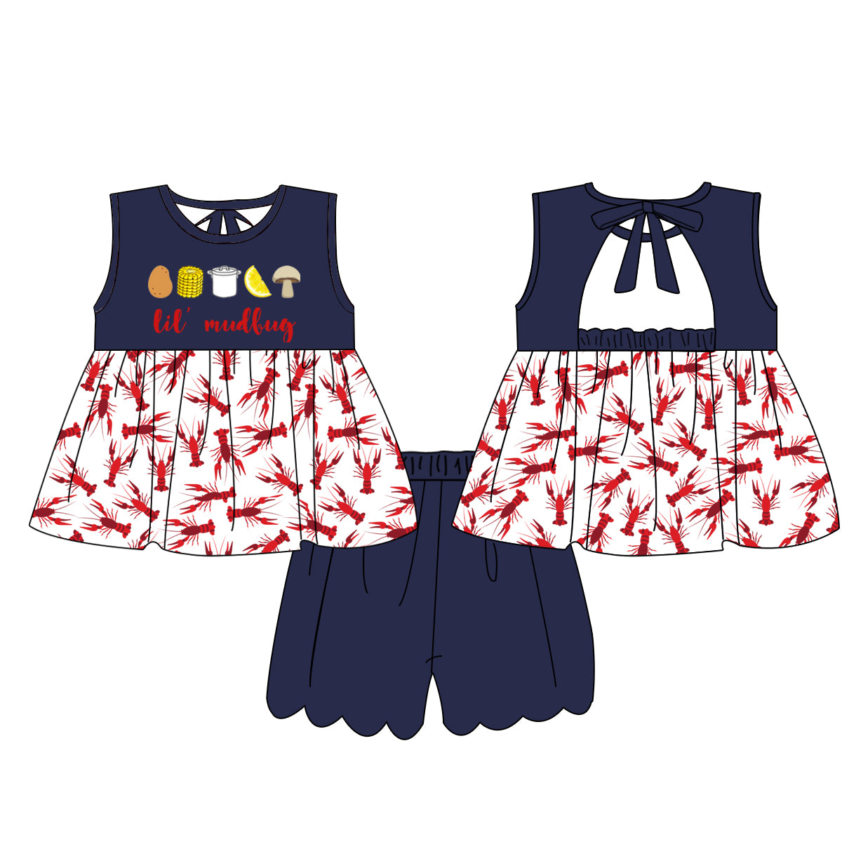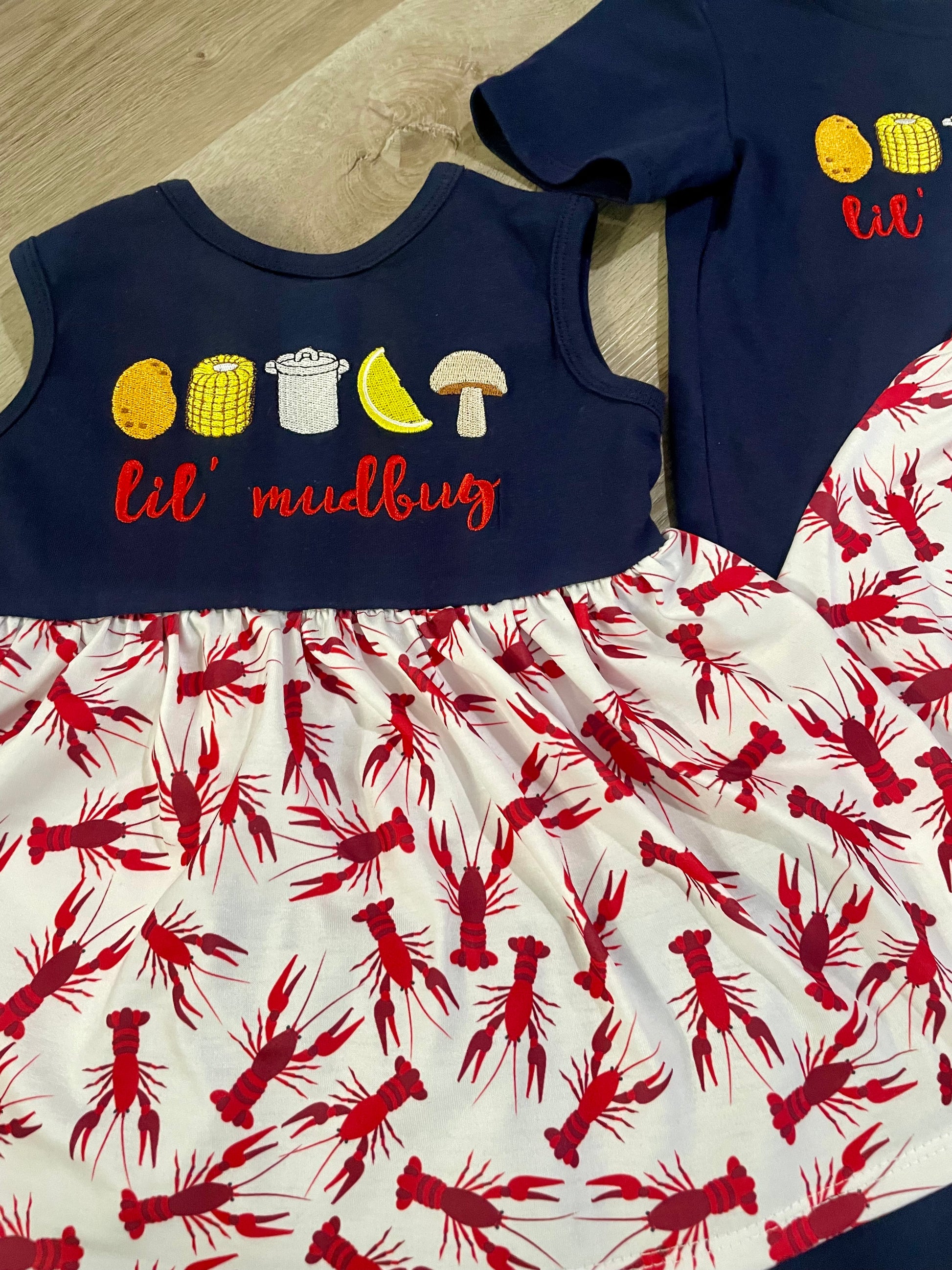 This Lil' Mudbug Girls Set features soft knit fabric for comfortable wear, highlighted by an exclusive crawfish print that adds unique charm. The set includes elastic waistband shorts ensuring an easy, flexible fit, while the bow back detail enhances the design with a delicate, stylish touch. Perfect for both playtime and special occasions, it combines comfort with standout style.