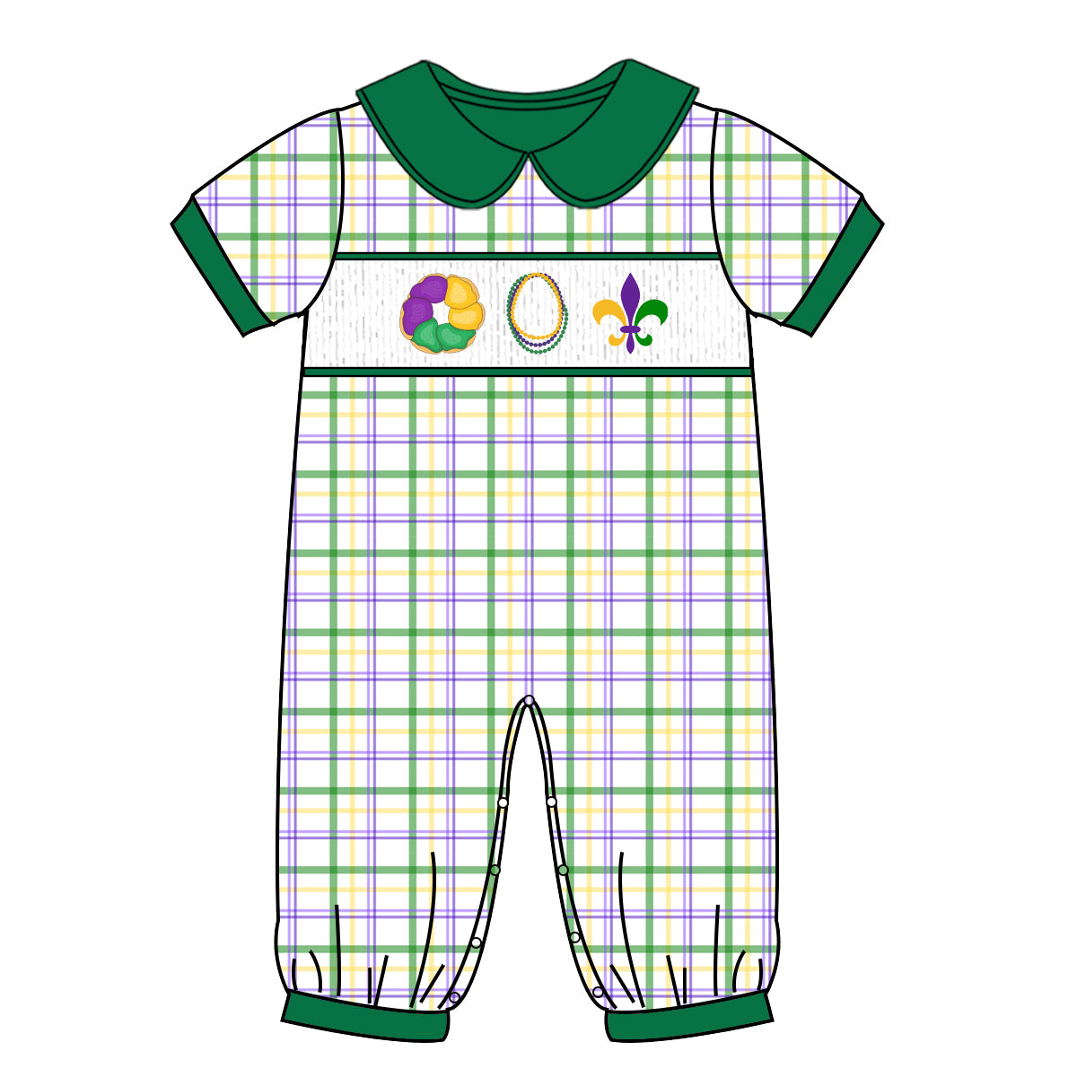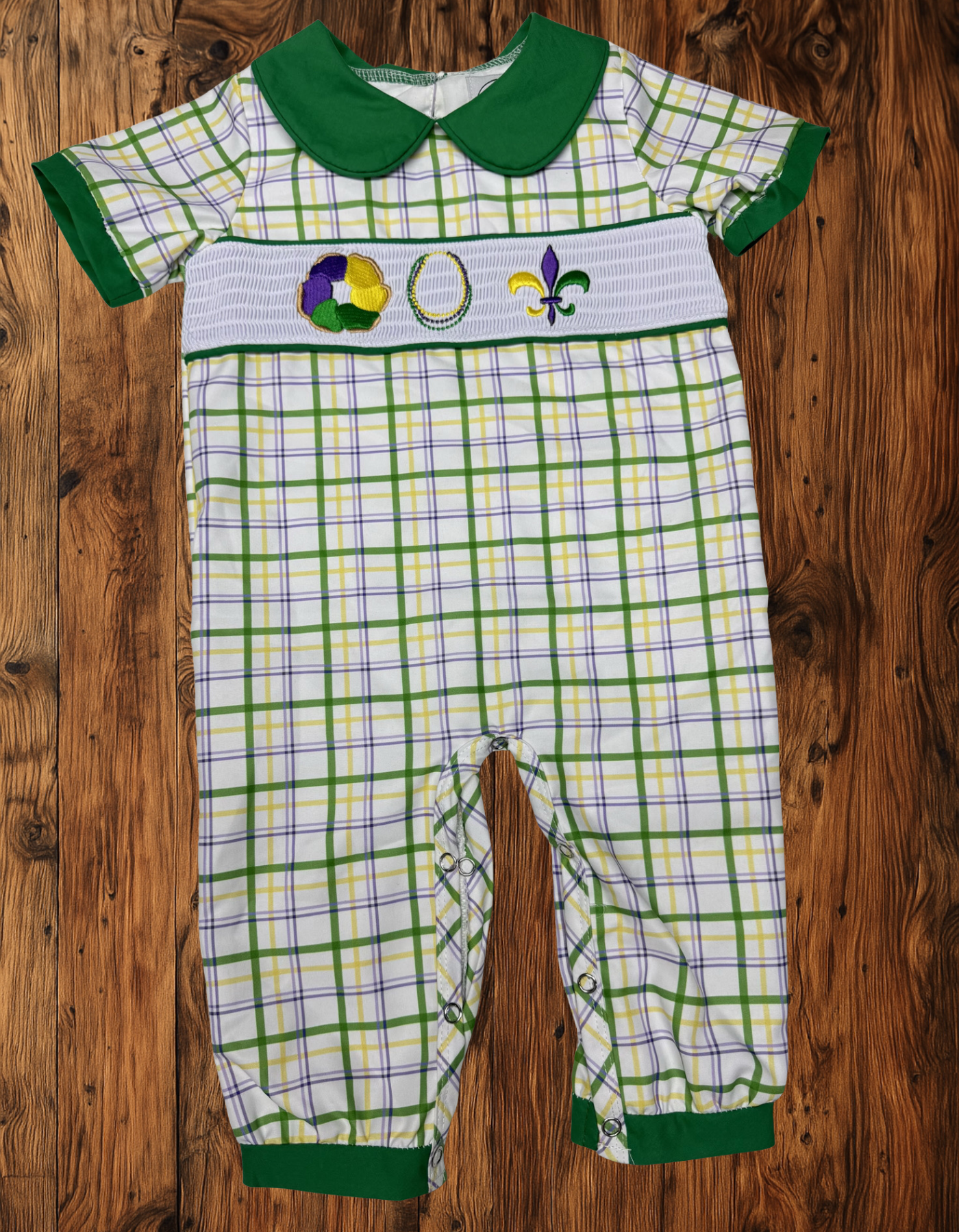 Get ready to celebrate in style with this festive romper. It showcases a hand-crafted plaid pattern in green, yellow, and purple hues. The smocked section is detailed with colorful fleur de lis, bead accents, and a king cake motif, perfectly capturing the spirit of Mardi Gras for your little one.