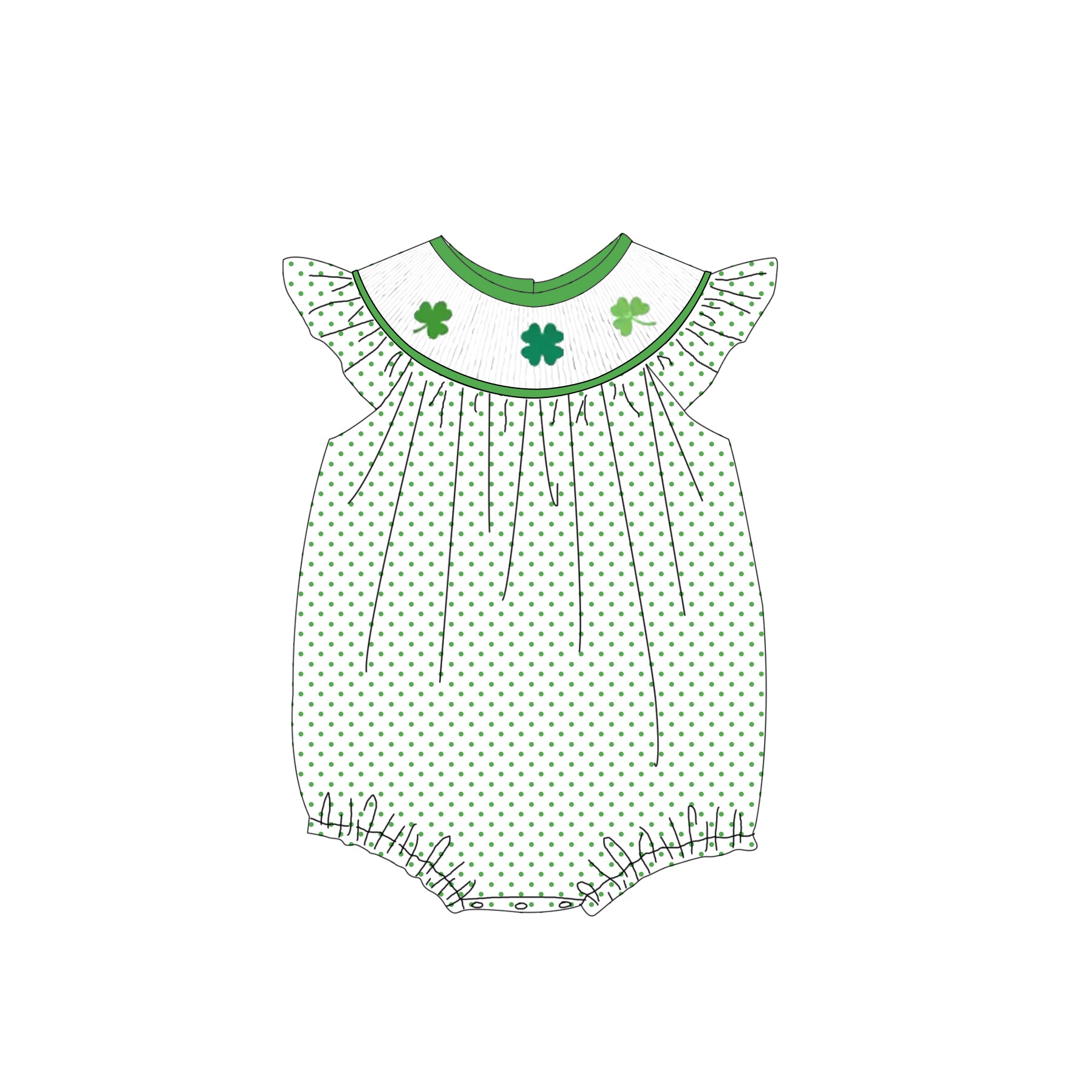 The Too Lucky Girls Bubble features a charming polka dot print and smocked design adorned with green clovers. Its expertly crafted woven fabric ensures a comfortable and flexible fit, combining style with ease of wear. This piece balances playful detailing and quality construction, perfect for adding a touch of luck and sophistication to any outfit.